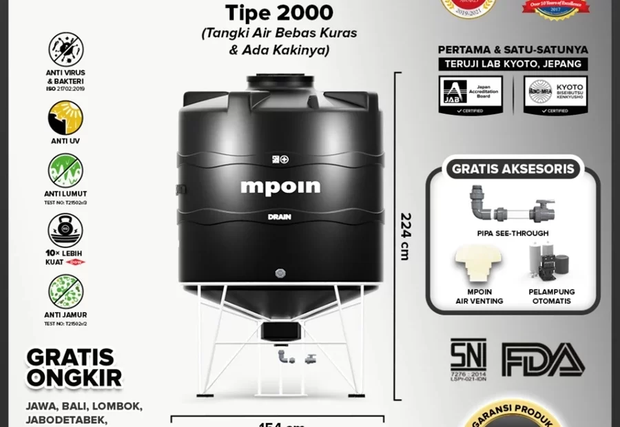 Tangki kaki MPOIN adalah pilihan ideal untuk kebutuhan air bersih rumah tangga. Dikenal juga sebagai tandon kaki atau toren kaki,… Tangki Tandon Toren Air Mpoin Drain