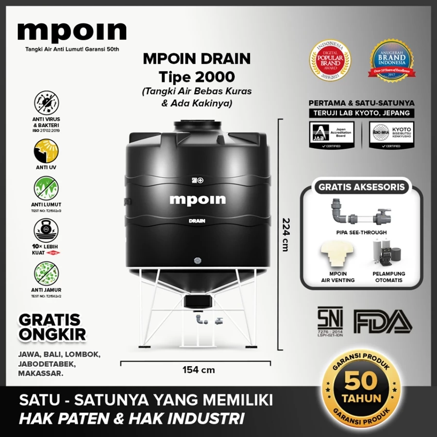 Tangki kaki MPOIN adalah pilihan ideal untuk kebutuhan air bersih rumah tangga. Dikenal juga sebagai tandon kaki atau toren kaki, produk ini dilengkapi teknologi Total Flush System dan pipa transparan (see-through pipe) yang memudahkan pengurasan hingga bersih tanpa repot.